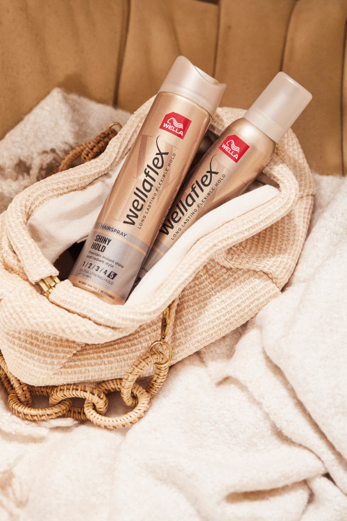 Używając gęstego grzebienia, zrób przedziałek z boku, zaczesując włosy na jedną stronę. Następnie spryskaj tę część lakierem Wella Deluxe Wonder Volume, aby wygładzić kosmyki i ustawić na swoim miejscu. Aby zwiększyć objętość włosów, nałóż lakier na opuszki palców i wmasuj u nasady