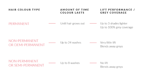 A coloração não permanente cobre cada mecha com cor; já a coloração permanente penetra a cutícula de cada fio, entrando no córtex capilar e se unindo aos cabelos. Mas quanto tempo demora para a tinta sair do cabelo? A coloração não permanente é removida após algumas lavagens. Já a coloração permanente, como o nome sugere, tinge os fios para sempre. No entanto, como os fios estão em constante crescimento, um pouco da coloração permanente sai a cada corte. Assim como existem diferentes tipos de cabelo, há diversos tipos de coloração, como podemos ver neste gráfico.