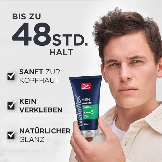- Entdecke die gesamte Wellaflex Men „Sanft zur Kopfhaut“-Styling- Reihe, für den Alltag und wichtige Anlässe