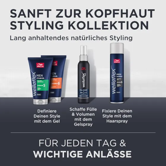 - Entdecke die gesamte Wellaflex Men „Sanft zur Kopfhaut“-Styling- Reihe, für den Alltag und wichtige Anlässe