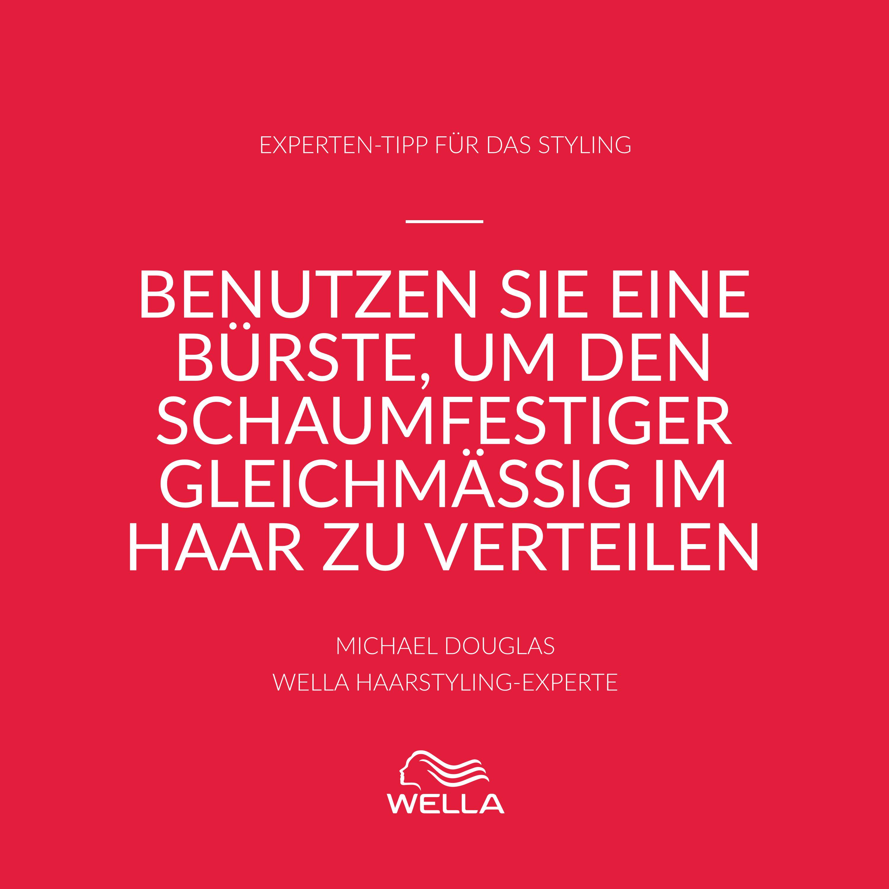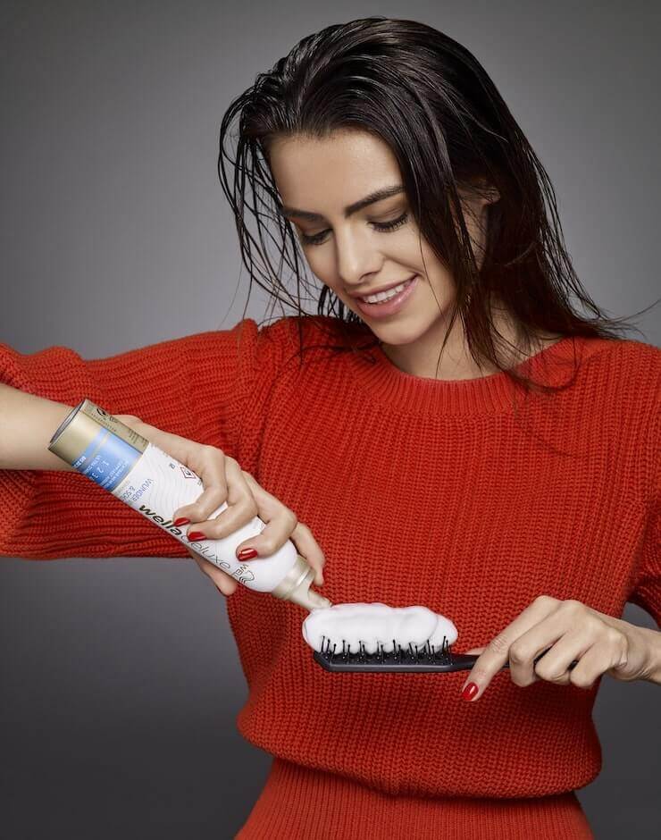Trage eine golfballgroße Menge Schaumfestiger auf Deine Bürste auf und arbeite das Produkt direkt in Dein Haar ein.