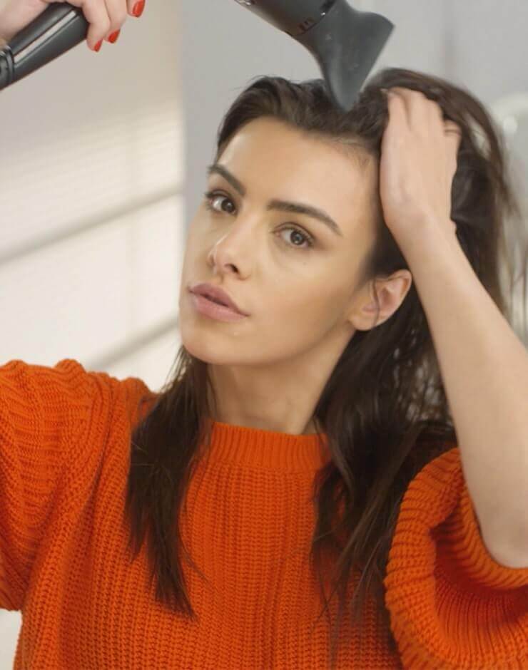 Trockne Dein Haar entweder mit einem Föhn oder einem Handtuch, sodass ca. 60 % Feuchtigkeit im Haar verbleiben.