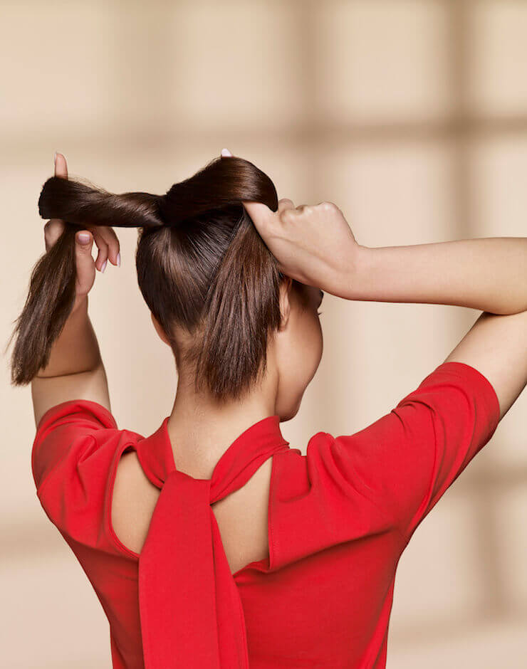 Die Haare zu einem Pferdeschwanz zusammenbinden und in zwei Teile aufteilen.