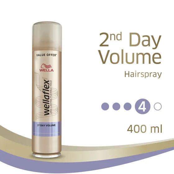 Seize every moment with full confidence and make sure your look is always on point, thanks to the wide range of Wellaflex styling products. Created to enhance your natural beauty and uplift your individual style, Wellaflex 2nd Day Volume hairspray gives your hair visibly more volume, even on the second day. Formulated with FlexActive technology, this extra strong hold hairspray provides you with 3 most sought-after signs of natural, flexible hairstyle. Fall in love with delicate hairtouch without any stickiness and achieve the reliable hold that will keep your hairstyle intact for up to 24 hours, without losing any flexibility allowing your hair to move freely. Convenient to apply and easy to comb out, Wellaflex 2nd Day Volume is a perfect solution for a quick fix. It also helps provide UV protection, so your hair will look beautiful, natural and healthy every single day.