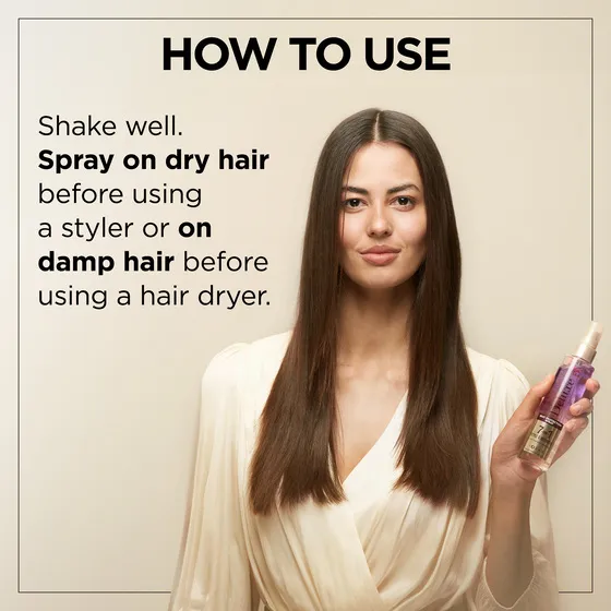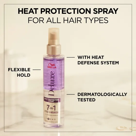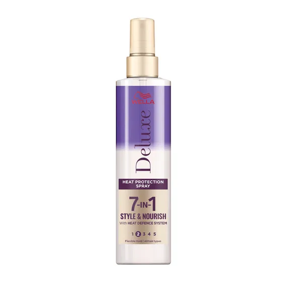 Wella Deluxe Heat Protection Spray gives your hair natural defense against heat up to 230°, also protecting against UV and humidity. The formula, powered by natural ingredients including tapioca starch provides an instant anti-frizz effect and boosts shine. Suitable for all hair types, the 2-phase heat defense system changes colour to lilac when shaken so you know you’re ready to give your hair that shield it deserves against daily aggressions!