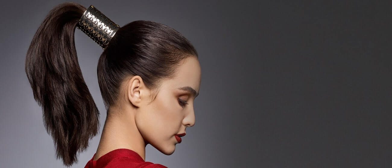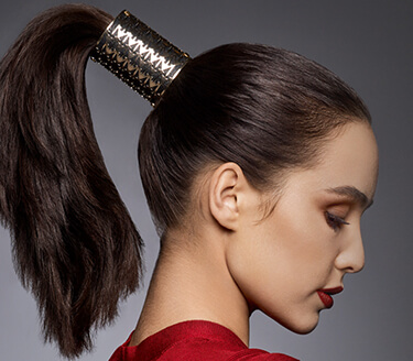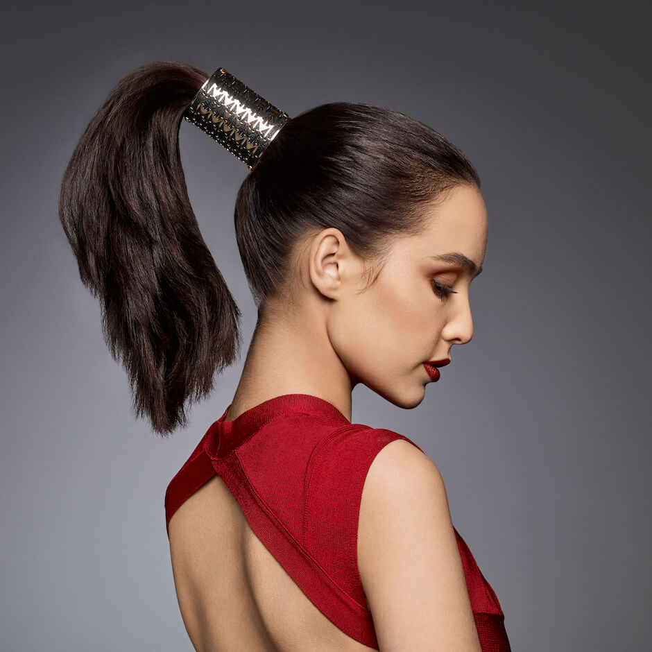 Create a high pony tail and secure it with a band. Now back comb the roots of the ponytail and put in another band about 5 cm away from the head. Finish by wrapping a bracelet around the base of the ponytail.