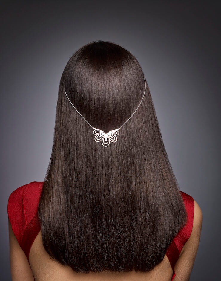 Create two tiny braids at the front of either side of the head. Attach each end of the necklace to the braids. Finish with a strong hold hairspray.