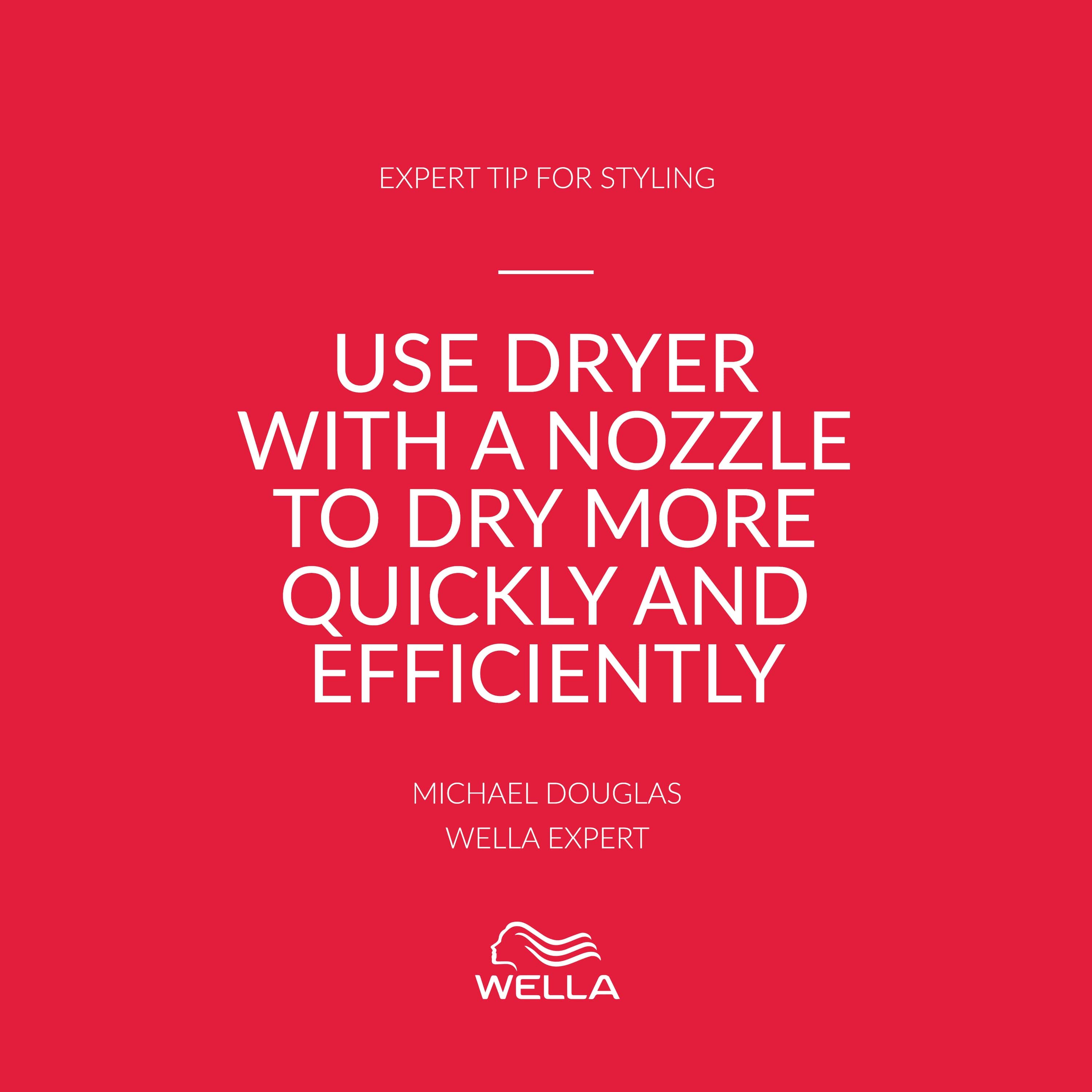 The best blow out begins with heat protection. Spritz Wellaflex Heat Protection Normal Hold Styling Spray from root to tip, then blast your hair until it’s about 60% dry.