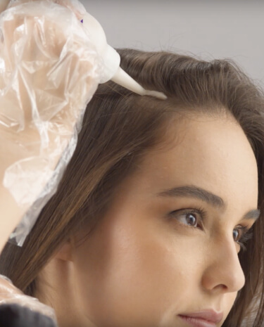 Place a towel around your shoulders. Then, using the nozzle of the developer bottle, squeeze your hair dye directly into the roots, ensuring you reach the lower layers, too.