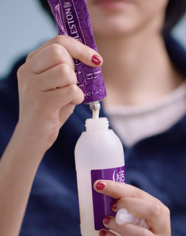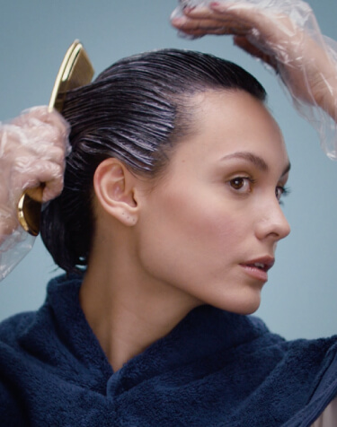 First, mix the shade by squeezing the Color Cream into the Color Reactivator inside the Developer Bottle. Shake the bottle to blend, then apply your jet black color to the roots using the targeted nozzle.