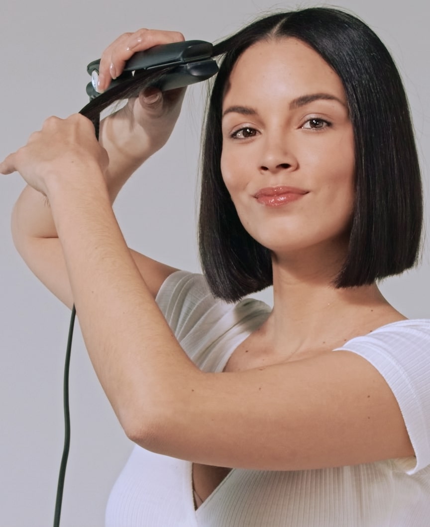 Make a centre parting and blow-dry hair with a medium-sized round brush. Use a blow dryer with a pointed nozzle and direct the heat down for smoother hair.