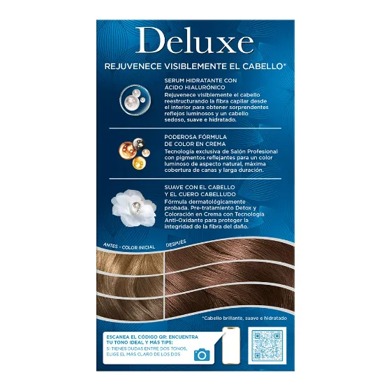 Deluxe llegó con la nueva gentil rutina de color en 3 pasos ¡tu cabello lucirá visiblemente rejuvenecido! Esta poderosa fórmula trae la mejor tecnología del cuidado de la piel a tu cabello, reestructurando la fibra capilar desde el interior para obtener sorprendentes reflejos luminosos, para un cabello suave e hidratado. Deluxe brinda tecnología exclusiva profesional con pigmentos puros para un color luminoso, de aspecto natural y 100% cobertura de canas con larga duración. ¡No escojas ya entre el color o el cuidado para tu cabello, con Deluxe ambos son posible!