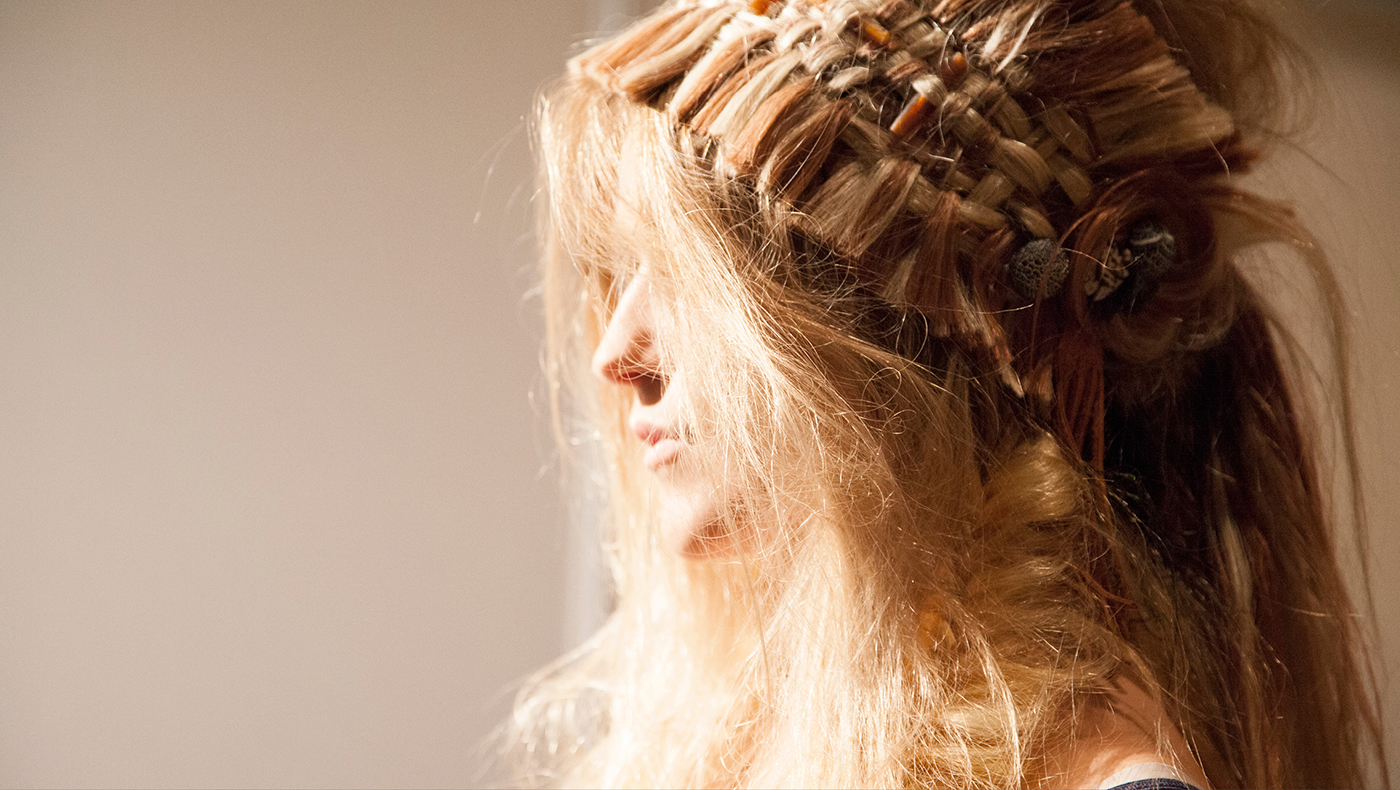 Long hair braided to a raw fish tail and a woven hair band holding the hair at the crown. Provide a captivating style where color evolves from a bronze blonde to a light blonde with vibrant Limoncello golden accents.