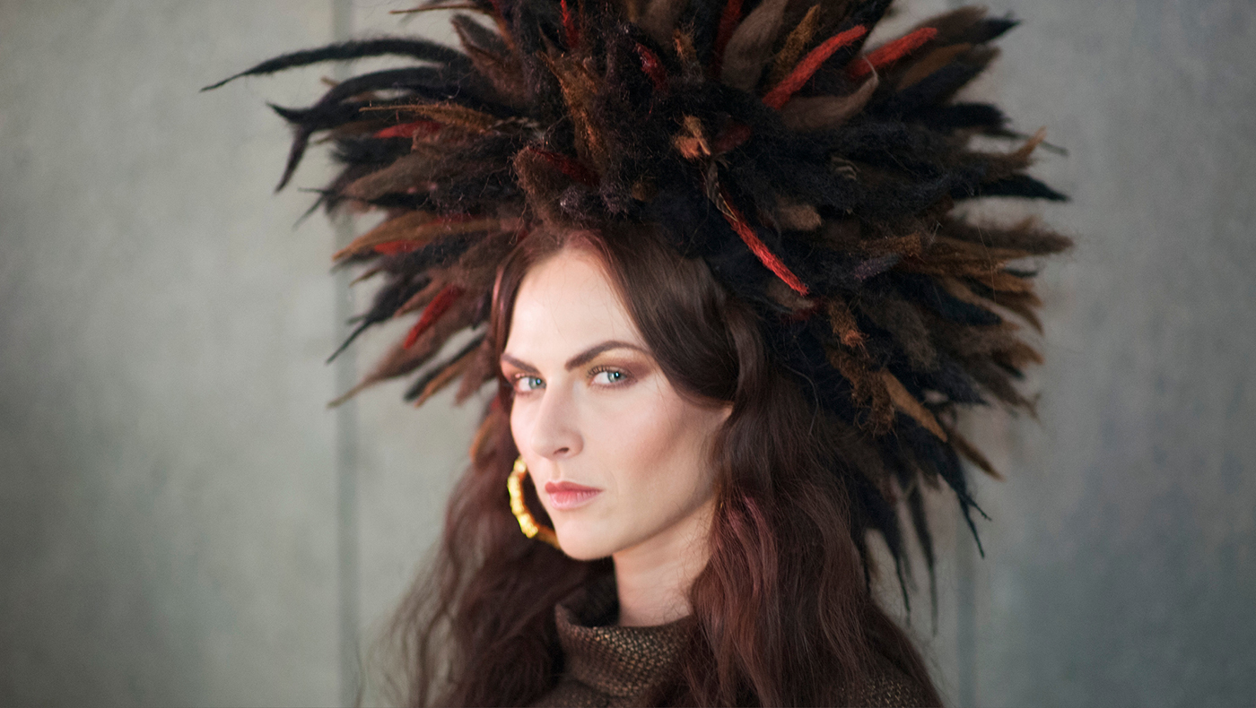 Haute couture translated in hair. The crown adornment is inspired by hair yet created out of raw fabric. Her unblemished brunette hair is cascading wit natural movement.