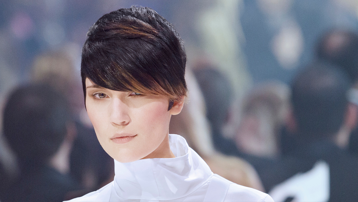 An androgynous take on beauty matches a short haircut with a long top and a head turning high quality finish. An overall deep brunette colour reveals a subtle line of light around the front.