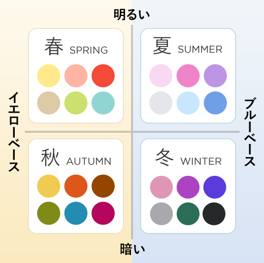 そこからさらに四季をイメージした「スプリング(春)」「サマー(夏)」「オータム(秋)」「ウィンター(冬)」のグループに分けて、似合う色の範囲を導き出す分類法が一般的です。